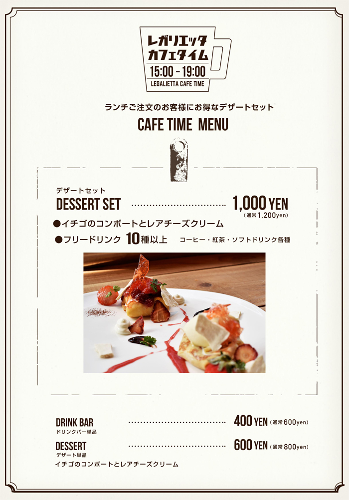 5月2日から レガリエッタのカフェタイムがスタート! ドリンクバーが15:00〜19:00まで時間制限なしでご利用いただけます。